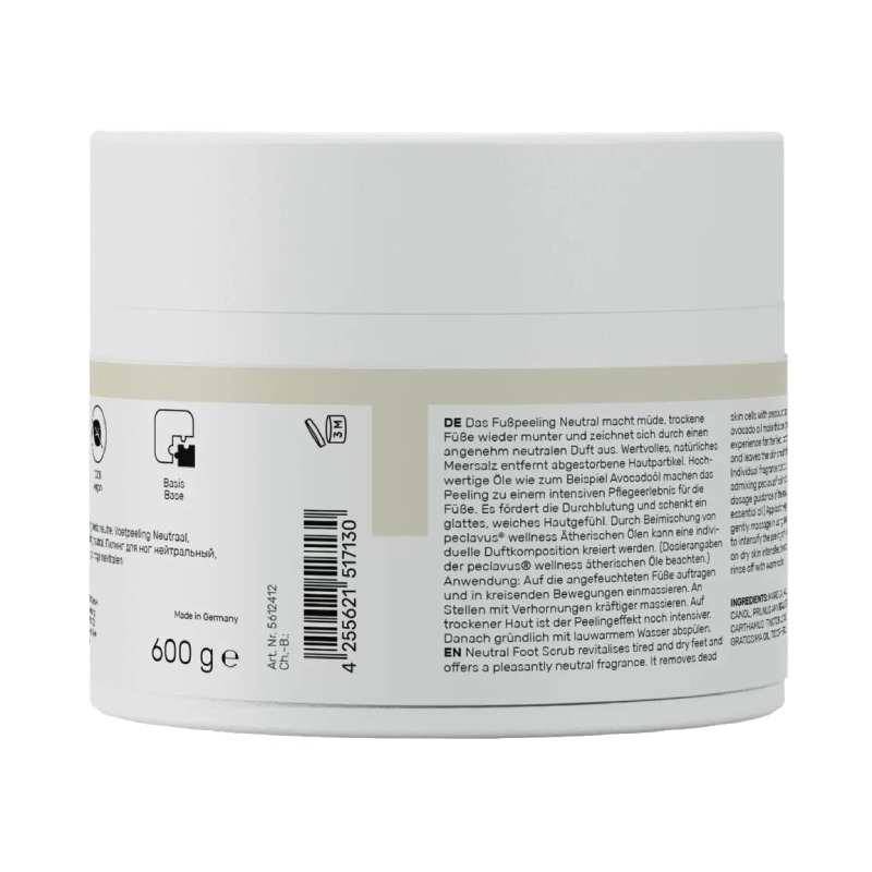 Das peclavus® wellness Körperpeeling Neutral reinigt und pflegt die Haut besonders sanft. Feines Meersalz entfernt abgestorbene Hautzellen und regt die Durchblutung an, während wertvolle Pflanzenöle die Haut gleichzeitig nähren und vor dem Austrocknen schützen. Die parfümfreie, neutrale Rezeptur ist ideal für empfindliche Haut und für alle, die eine besonders milde, natürliche Pflege bevorzugen. Die Haut fühlt sich nach der Anwendung glatt, weich und erfrischt an.